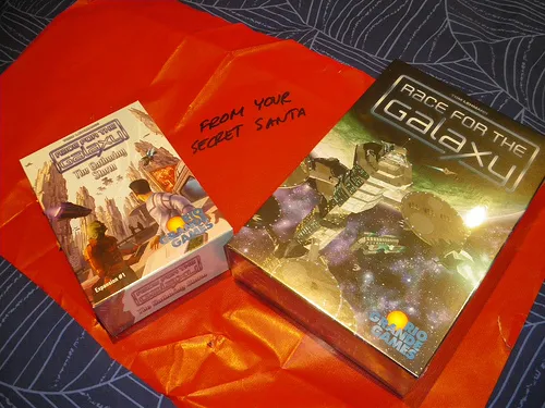 My Secret Santa reasoned that the second board game in order of preference in my wishlist was a good choice (a great choice, I'll add) but not enough for him/her, so I have also received the first expansion of the game. I can remove from my wishlist Race for the Galaxy and Race for the Galaxy: The Gathering Storm, both from Tom Lehmann.
